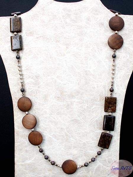 Herbstjaspis, 8 mm Bronzit, 22x30 mm Holzscheiben dunkelbraun, 30 mm Swarovski Glasschliffperlen bicone, 4 mm (Smoky Quartz) filigrane Metallperlen silberfarben 6 mm Silberperlen (hartversilbert), 3,2 mm Silberperlen (hartversilbert), 2,5 mm