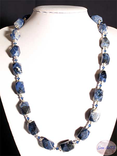 Sodalith, 12x16 mm Swarovski Glasschliffperlen bicone, 4 mm (Dark Sapphire) Silberscheiben (versilbert), 6 mm Silberperlen (versilbert), 3 mm