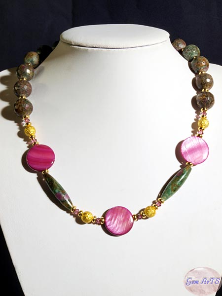 Zoisit, 8x26 mm Zoisit facettiert, 14 mm Perlmuttscheiben, pink, 20 mm Swarovski Glasschliffperlen bicone, 4 mm (Rosé Satin) Goldkugeln (vergoldet) gefrostet, 8 mm Goldscheiben (vergoldet), 5 mm
